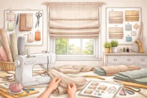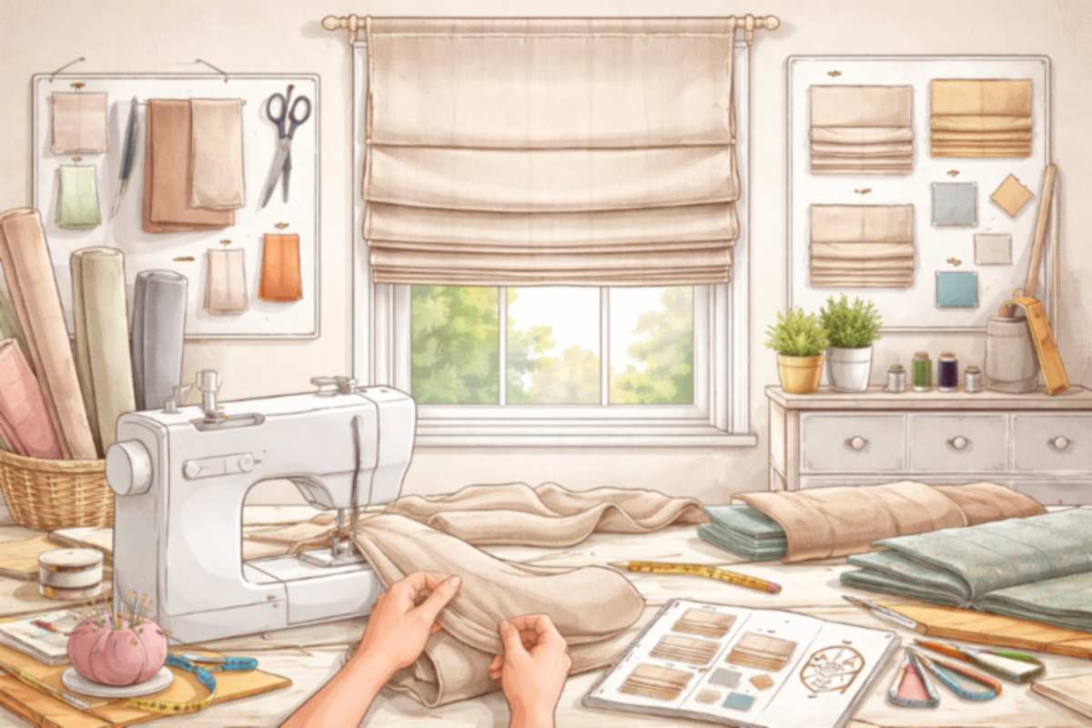 Misura. Prendi larghezza del vano e altezza finita. Aggiungi margini di cucitura: 2–3 cm per lato e 4–6 cm in basso per l’orlo. Se monti a soffitto o a parete, verifica gli ingombri del meccanismo a catena o del binario.